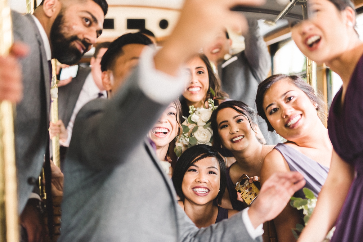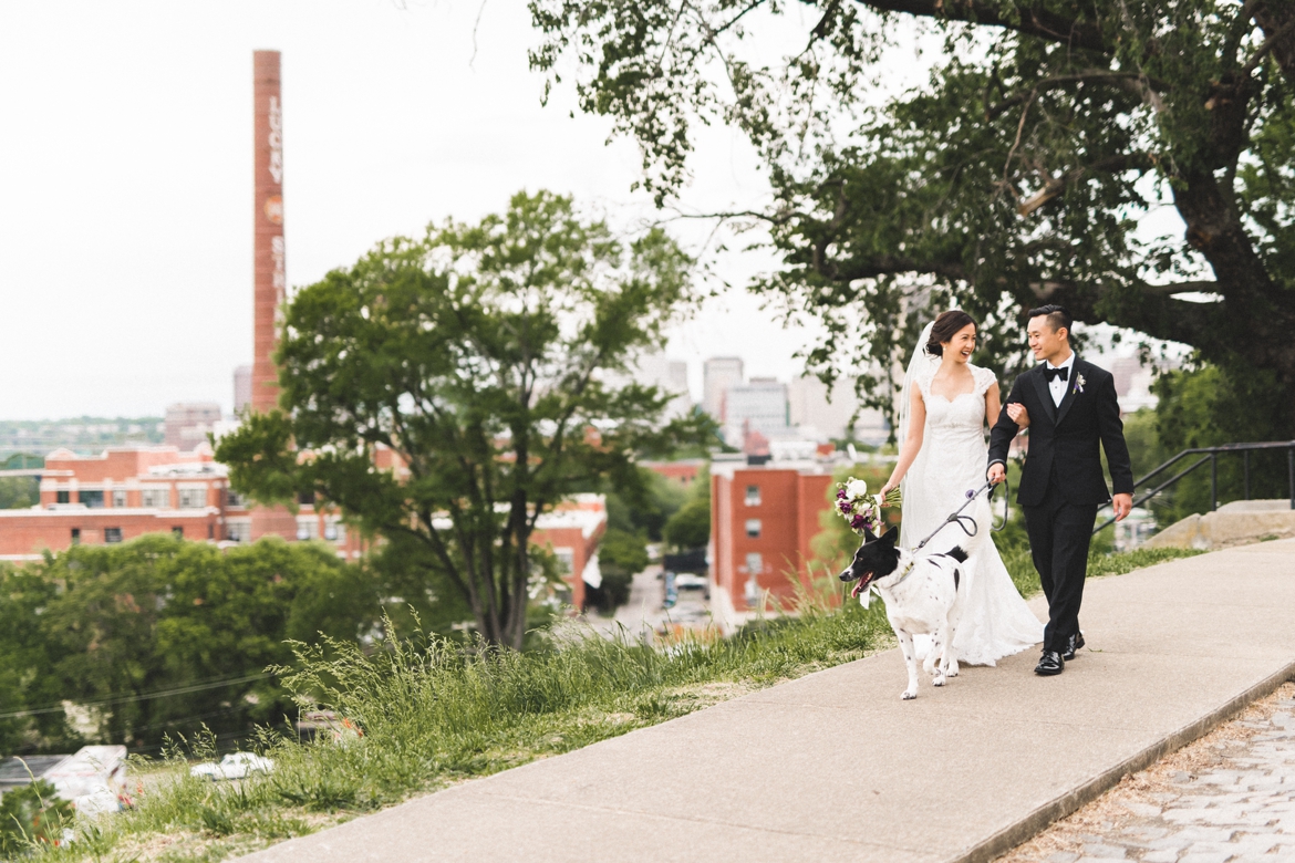 Up until the day of their wedding, they were predicting storms, so we were prepared with umbrellas… but luckily the only rain we saw came during the ceremony where everyone was dry and comfortable in the stunning Cathedral of the Sacred Heart. After a few portraits, we hopped on the trolley for a mini tour of Richmond, stopped by Charm School for some photos in front one of the best Richmond murals, and then headed to Libby Hill Park where Monica got the BEST surprise from Lee- an appearance from their best friend, Cash.